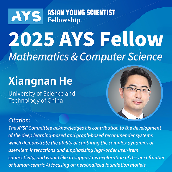 2025年9月5日,亚洲青年科学家基金项目(Asian Young Scientist Fellowship, AYSF)正式公布了的12位亚洲青年科学家基金项目研究员(AYS Fellow)名单,中国科学技术大学何向南教授成功入选数学与计算机科学领域AYS Fellow,成为本年度该领域四位杰出代表之一。
