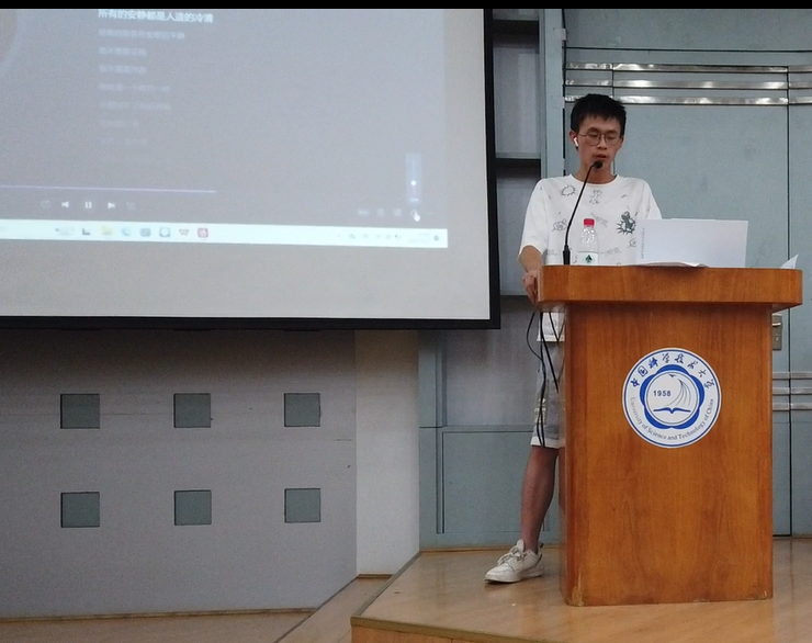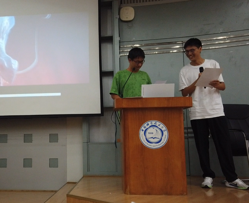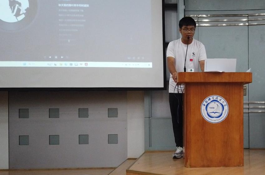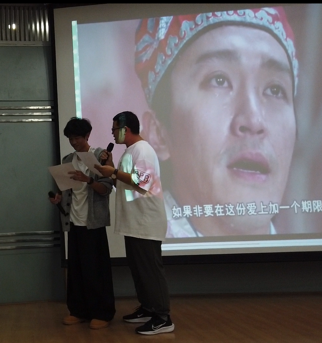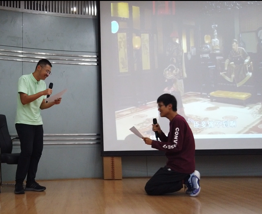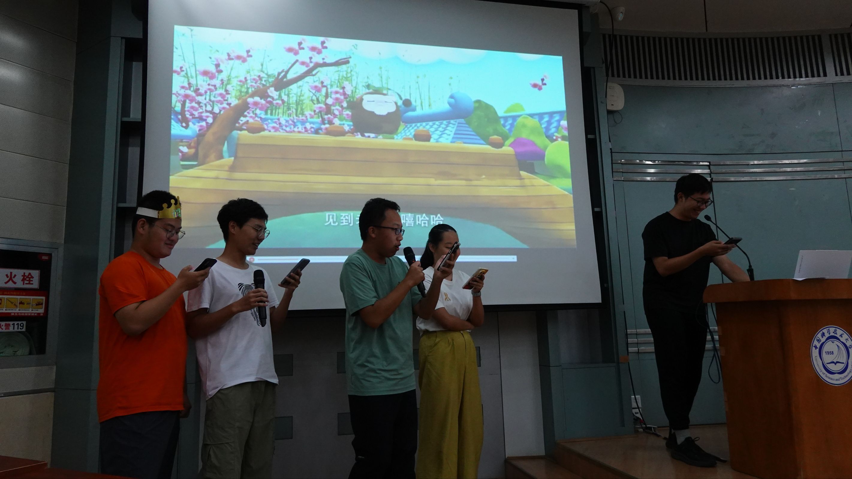 随后,便到了小游戏与节目表演的混合穿插环节。在自由麦环节,主持人宋运桥组织大家齐唱《lemon(中文版)》,邹欣妍老师与大家齐唱《遇见》,在“配音游戏”中,陈越,王玺云,杨涵舒,李彦辰,聂哲临五位同学表演了《果宝特攻》片段,融合了科大校情,幽默风趣,笑点频频。吴嘉顺与林毅晨合作带来了《哪吒》经典片段配音,黄禹皓和朱梓桥合作带来《臣妾做不到》片段表演,胡凯锐为大家带来日语片段配音《暗杀教室》,精彩纷呈,现场掌声、笑声不断。