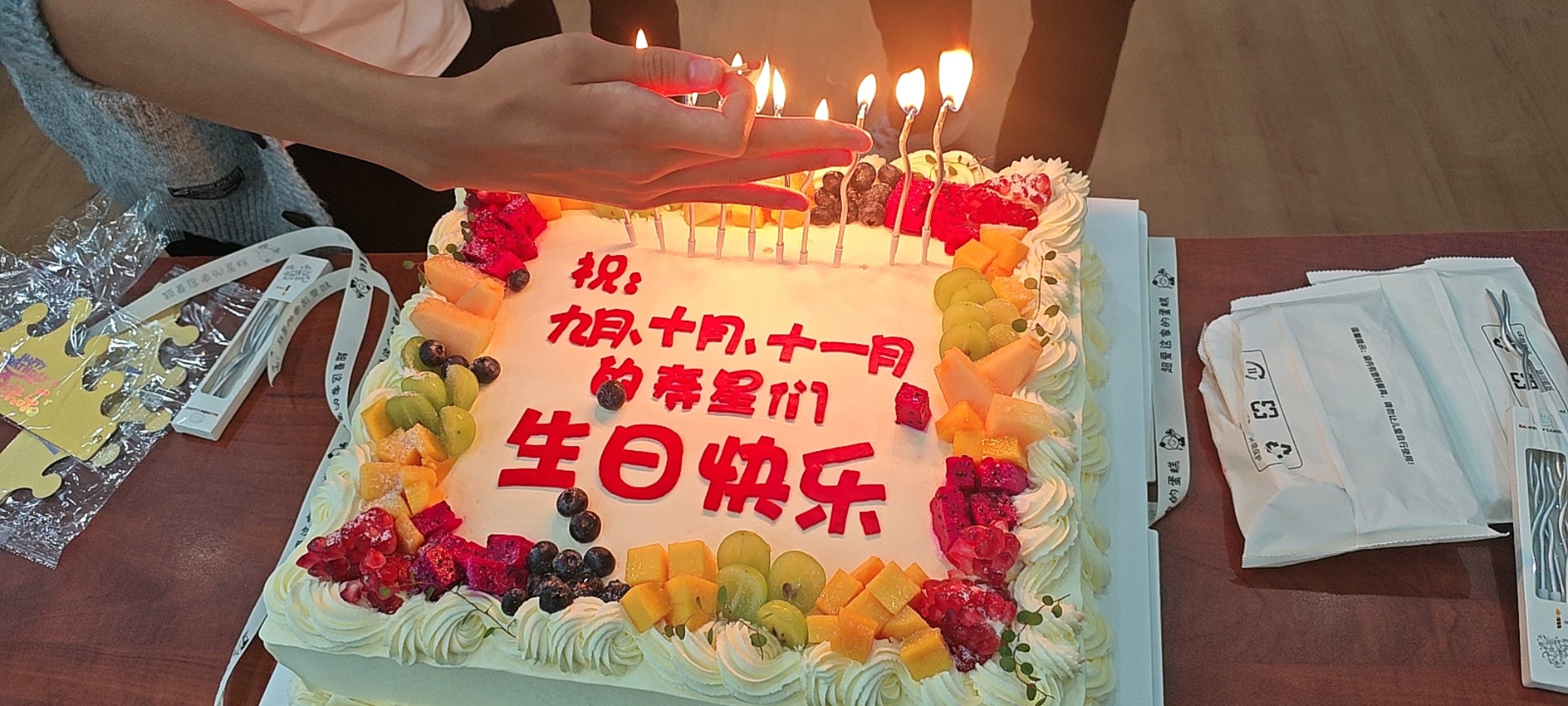 首先,进行的是给各位九至十一月过生日的同学唱生日歌的环节,随后由各位小寿星一起吹蜡烛,切蛋糕,全班同学分享生日喜悦。