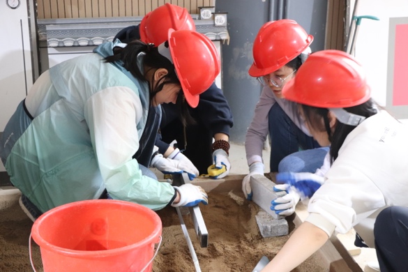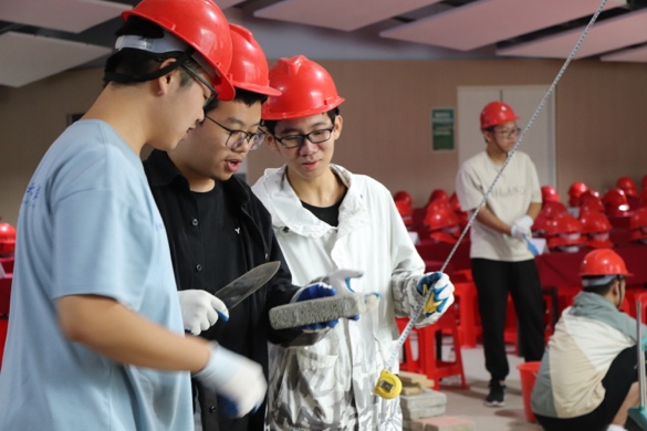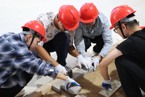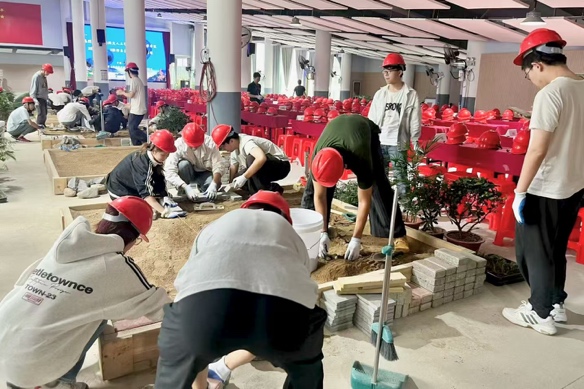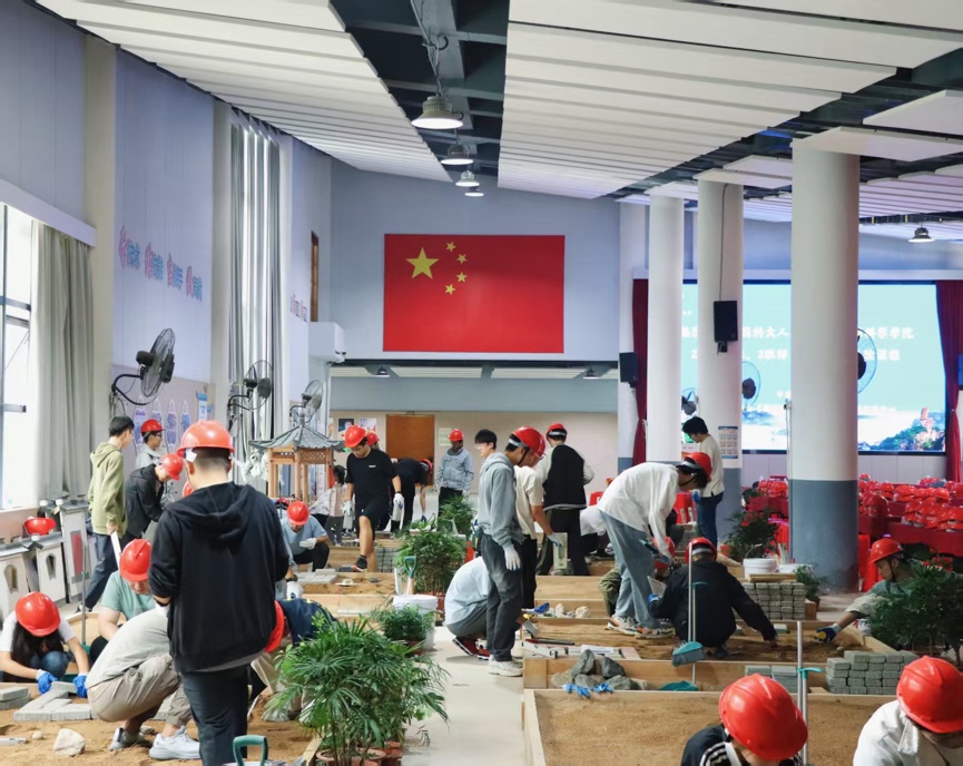 进入实践环节后,七个小组迅速进入状态。同学们头戴安全帽、手戴防护手套,分工明确、配合默契,现场秩序井然。在80分钟的建造时限内,大家热情高涨,不惧辛劳,将智慧与汗水倾注于一砖一瓦、一草一木的搭建中,充分展现了科大学子昂扬的劳动热情与卓越的团队协作能力。最终,所有小组均按时高质量地完成了微景观造园任务。