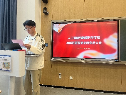 大会在庄严的国歌声中开幕。学院党总支副书记阳思同志宣读了《关于成立人工智能与数据科学学院高新区第五党支部党员大会筹备工作领导小组的文件》。随后,筹备工作领导小组负责人张浩天同志代表小组作筹备情况报告,介绍了大会时间议程请示、委员候选人推荐、选举办法拟定等前期筹备工作进展。
