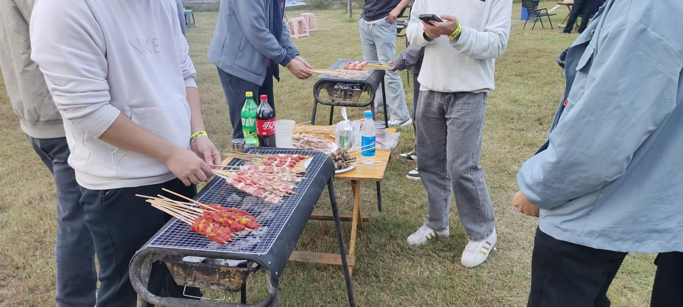 夕阳西下,暮色渐起。傍晚时分,最令人期待的烧烤环节正式开始。同学们纷纷动手,支起烧烤架,通力协作。烤鱿鱼、五花肉、鸡排、面筋……各种食材在烤架上滋滋作响,香气四溢。大家分工明确,有的刷油,有的撒料,有的负责翻面、装盘,彼此关照,互相帮助。袅袅炊烟与欢声笑语交织,烧烤带来的暖意融融,恰到好处地驱散了秋日傍晚的微寒,也温暖了每一位同学的心田。