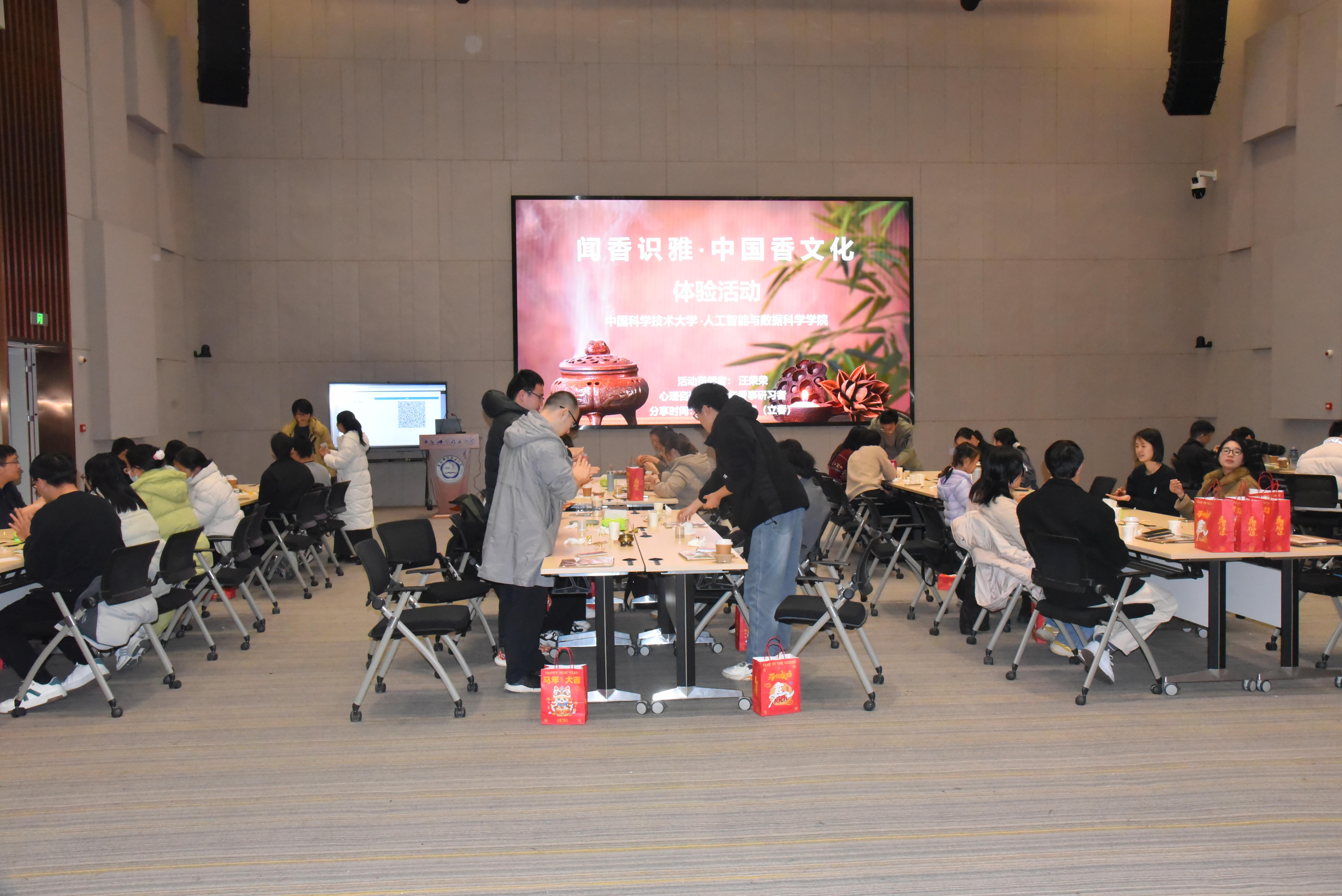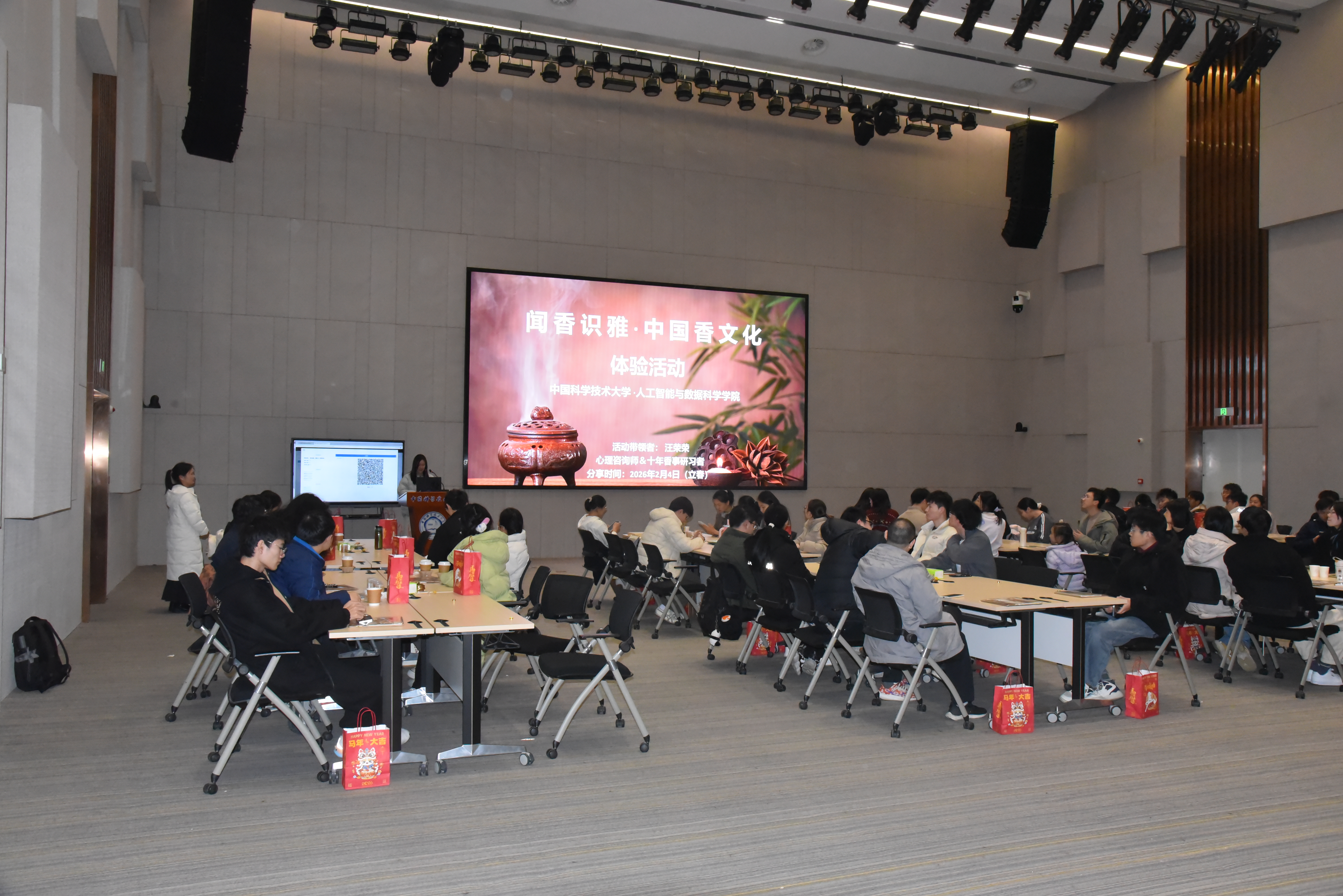 新春将至,万象更新。为弘扬中华优秀传统文化,丰富留校师生假期生活,中国科学技术大学人工智能与数据科学学院联合高新园区团工委、高新园区建设与管理委员会办公室于2月4日下午在高新校区图书馆C101举办“春启高新,香暖人心”香道文化体验活动。活动由学院团委副书记韩老师主持,学院党总支常务副书记阳思老师到场参加。活动特邀十年香道研习者汪荣荣老师担任主讲并带领实践,吸引了众多留校师生的积极参与。