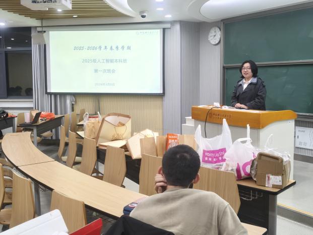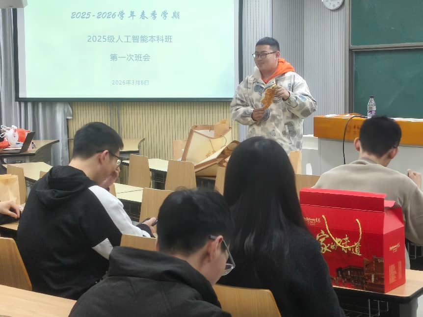 2026年3月8日,2025级人工智能本科班在西校区3A212召开新学期主题班会暨组织生活会。本次班会包含学习科研和安全教育两大主题,组织生活会上由宿舍代表分享发言,并进行了团员评议。班主任邹欣妍老师主持本次班会。