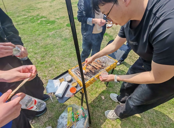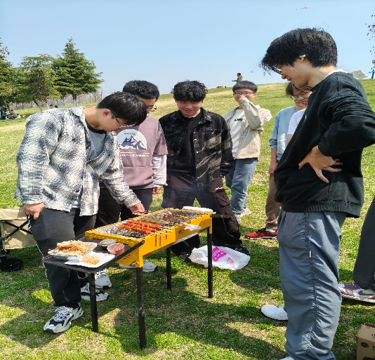 中午,活动进入烧烤环节,同学们围在烧烤架旁,分工合作、配合默契,有的负责生火,有的负责摆放食材,有的认真翻烤、细心调味,现场不时传来阵阵欢声笑语。随着炭火渐旺,食材香气四溢,大家在亲手制作美食的过程中体验劳动乐趣,感受集体活动的温暖氛围。