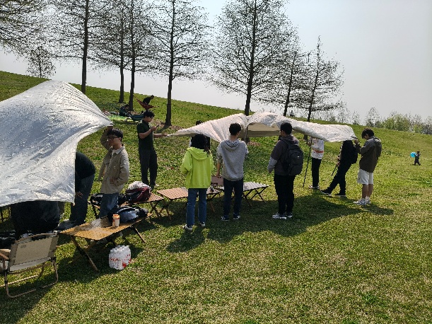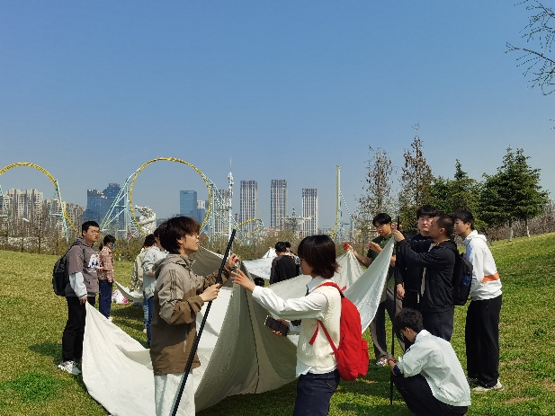随后同学们便开始了活动准备,一共有两套装备,由两组同学分别搭建,搭建过程中充满了欢声笑语,大家分工明确、密切配合,有的负责搬运器材,有的认真研究搭建步骤,有的动手固定支架、整理篷布。这种合作不仅增强了大家的实践能力,还进一步培养了集体意识和合作精神,让同学们在亲近自然的同时收获了成长与快乐。