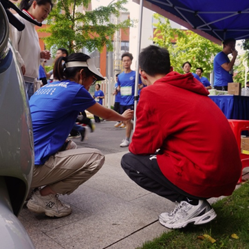 在赛程中,人工智能与数据科学学院在操场出口,赛道核心位置设置了补给点。在精心布置的补给点位上,志愿者们分工明确,有条不紊,为参赛选手们提供矿泉水和运动饮料。