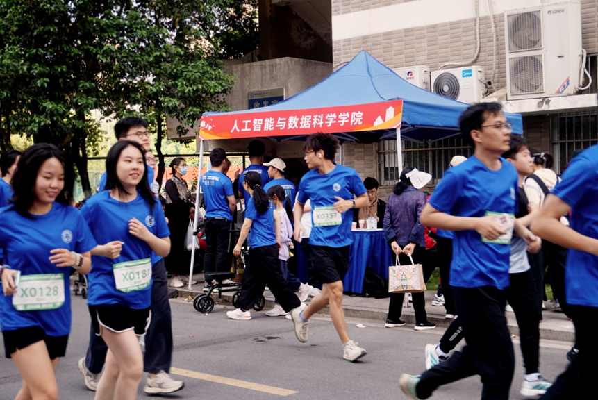 2026年4月25日上午,阳光洒满校园,五四青年跑活动如期而至。在这场跨学院联动的体育盛会中,人工智能与数据科学学院以赛道核心位置的创意补给点为阵地,通过专业的保障服务与趣味横生的“数智互动”,为参赛选手们筑起了一座充满温情与活力的“能量驿站”。