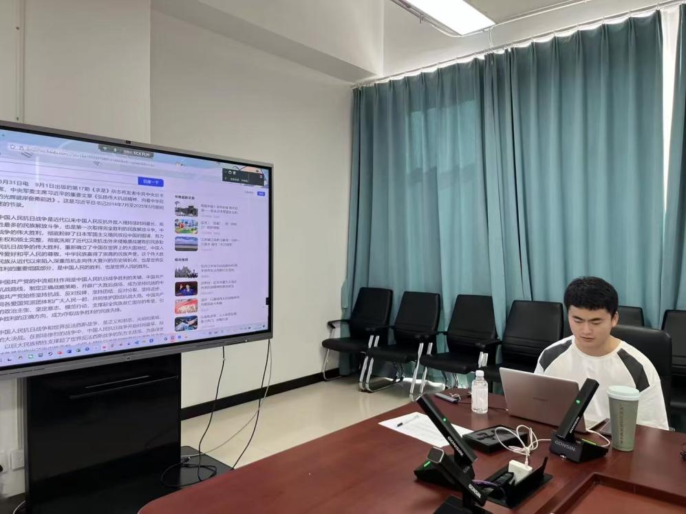 会议议程第三项,全体成员在本科生党支部副书记王世炟同志带领下,通过网络资源学习了中国惊叹世界的军事发展实力以及习近平总书记关于中国人民抗日战争相关重要论述。