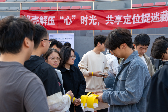 活动伊始,工作人员在操场上向参与者详细讲解了游戏规则。随后,活动进入分组与角色抽签环节,学生们通过高德地图随机分配“猫”和“老鼠”角色,并领取了主办方精心准备的角色手环。