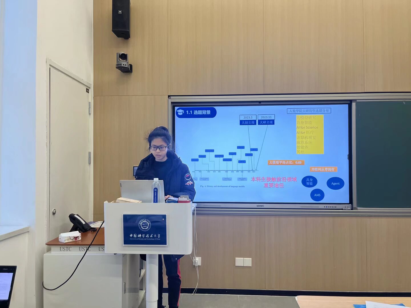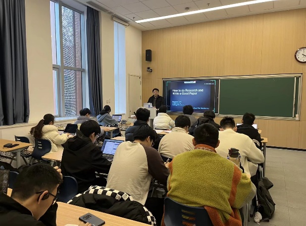 最后,人工智能专业2025级硕士生冯筱璐学姐则带来“学—研—创—毕”一体化经验包。冯学姐以自己的亲身实践为例,展示了自己从本科大研大创到优秀毕业论文的完整闭环。她对于AI的运用有着自己独特的理解,尽管AI无法替代人类的深度思辨,但在执行层面能极大提升效率,如自学相关知识、评估代码、制作演示文稿等。她还介绍了自己的“发现-实验-闭环迭代”的研究模式,即先设计小范围的实验验证想法,进行数据收集与分析,再撰写论文;基于此不断迭代,优化最终产出的内容。她的分享充满了实用性和针对性,让同学们深刻感受到这些项目并非遥不可及,只要有明确的目标、合理的规划和坚持不懈的努力就能够顺利完成。