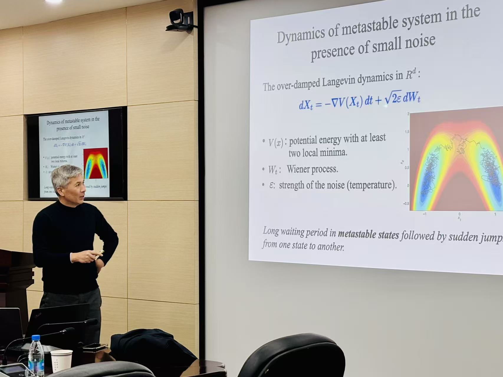 在报告环节,任维清教授以分子动力学模拟为背景,系统阐述了稀有事件研究长期面临的核心科学挑战。他指出,稀有事件具有发生概率极低、时间跨度巨大、且常隐藏于高维能量景观中等特点,导致传统模拟方法效率不足、难以捕捉其关键动力学路径。这一深刻的问题背景引起了在场师生的广泛共鸣。面对这一挑战,任维清教授首先深入浅出地介绍了其提出的具有里程碑意义的“弦方法”理论。随后,任教授重点探讨了机器学习与稀有事件研究相结合的前沿进展,系统地讲解了如何利用神经网络、强化学习等先进机器学习技术,自适应地探索高维构型空间、挖掘反应坐标,并实现稀有事件的高效采样与预测。最后,任教授还分享了其团队在此交叉领域取得的多项突破性成果,包括开发出更高效、更精准的算法,显著提升了稀有事件研究的计算效率与适用范围,为在更复杂体系中开展相关研究开辟了新路径。