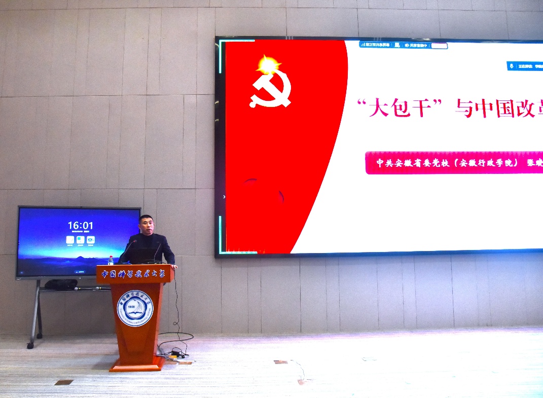 为深入学习贯彻习近平新时代中国特色社会主义思想,深化党史学习教育,传承改革精神、强化党性修养、树立和践行正确政绩观,2026年3月4日下午,学院党总支在图书馆C101会议室举办专题党课。党课由学院党总支常务副书记阳思老师主持,学院全体党员到场参加。本次党课特邀中共安徽省委党校(安徽行政学院)马克思主义学院副院长张晓亮同志,以“‘大包干’与中国改革”为题,为学院全体党员带来了一场生动且深刻的报告。