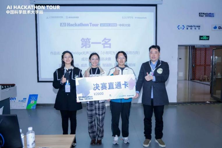 随后,嘉宾们为获奖队伍颁奖。第一名Echo队打造的"无声之桥"聚焦听障人群的沟通需求,第二名"勿忘我"团队开发了面向阿尔茨海默症患者的AI电话预防服务,第三名InterReview团队则构建了AI模拟面试官工具。本次比赛的前五名队伍将于3月21日至22日赴南京参加全国总决赛,代表科大出战。