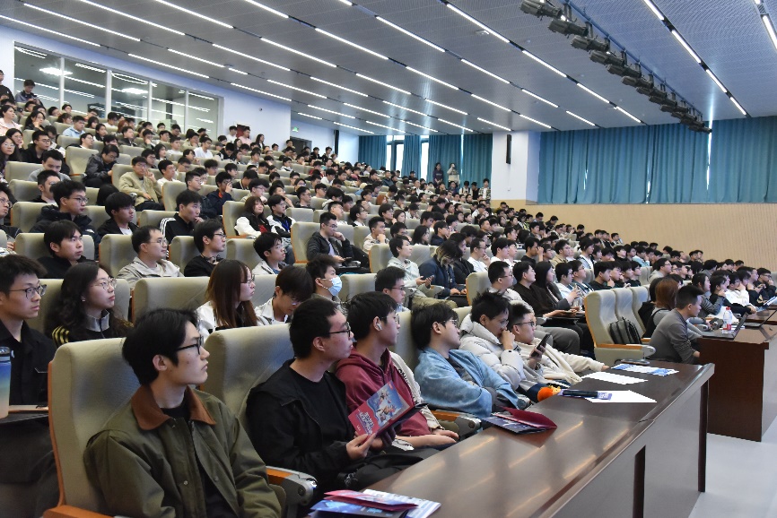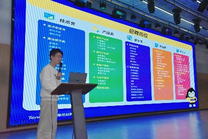 下午14时,活动在一号学科楼B100报告厅拉开帷幕。韩老师首先进行了开场致辞,欢迎同学们来到现场进行交流。宣讲环节中,腾讯、容知日新、哔哩哔哩、科大讯飞研究院、思朗科技的企业代表依次登台,从企业发展概况、核心业务布局、技术方向以及实习岗位需求等方面进行了详细介绍。各企业重点围绕人工智能、大模型、数据分析等前沿领域展开,展示了当前行业发展趋势及人才需求方向,激起了现场同学的浓厚兴趣。