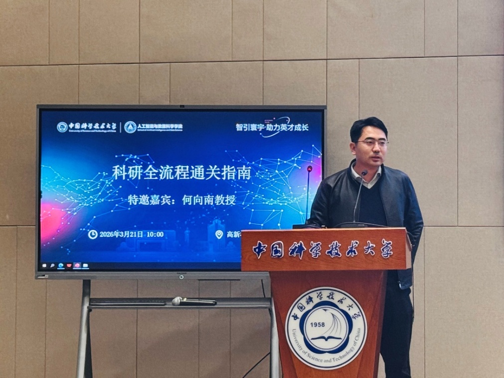 2026年3月21日,人工智能与数据科学学院第十二期“智引寰宇·英才成长沙龙”在高新校区图书馆GT-C101成功举办。本次活动特邀何向南教授作为主讲嘉宾,为学院同学带来精彩讲座,现场座无虚席。何向南教授以其丰富的科研经验与深刻的学术见解,系统梳理了从入门到深耕的科研路径,为在场学子的学术成长提供了切实可行的行动地图,并围绕关键环节分享了宝贵经验。