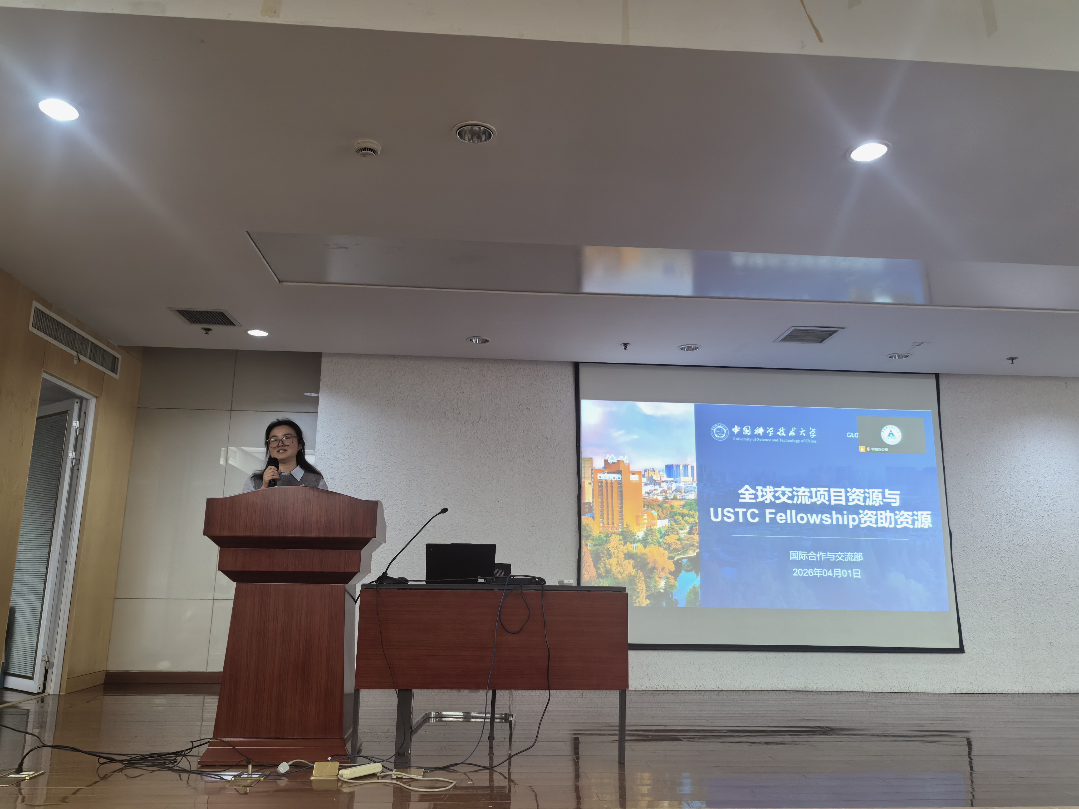 分享会分为多个环节,全面覆盖了暑研的政策、资源、申请流程与亲身经验。首先,国际合作与交流部王节琴老师详细介绍了学校“飞跃重洋”系列项目,涵盖暑期科研、暑期课程与学期交换等多种形式,并系统解读了包括“USTC Fellowship”包干制资助、院系分包项目以及国家留学基金委(CSC)项目在内的各类资源支持。她还现场介绍了学校Vista一站式海外交流流程操作平台,为同学们提供了清晰的申请指引。